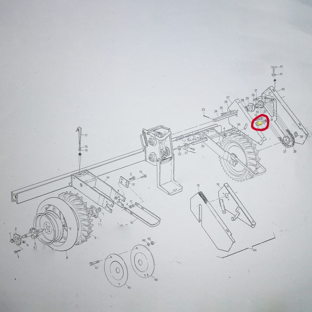 Δαχτυλίδι αποστάτης ροδών μετάδοσης κίνησης, διέρχεται βίδα 8*45 με παξιμάδι και ροδέλα, κάτω από το ρουλεμάν του τετράγωνου άξονα.